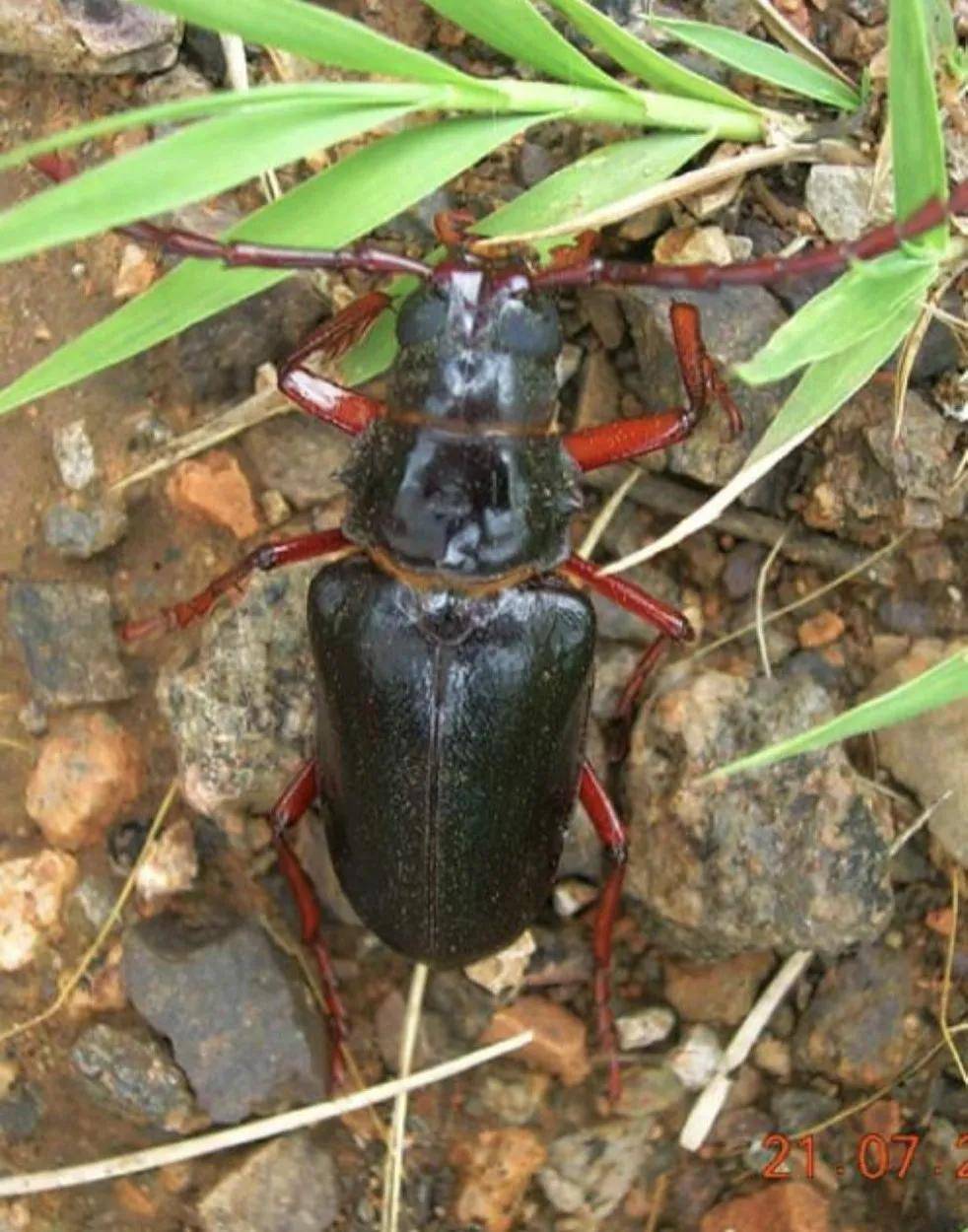 而大牙土天牛也和家族内其他成员保持了一致的形态特征,它全身披着黑红色的铠甲,触角由内向外逐渐变为暗红色,看上去还有点霸气。