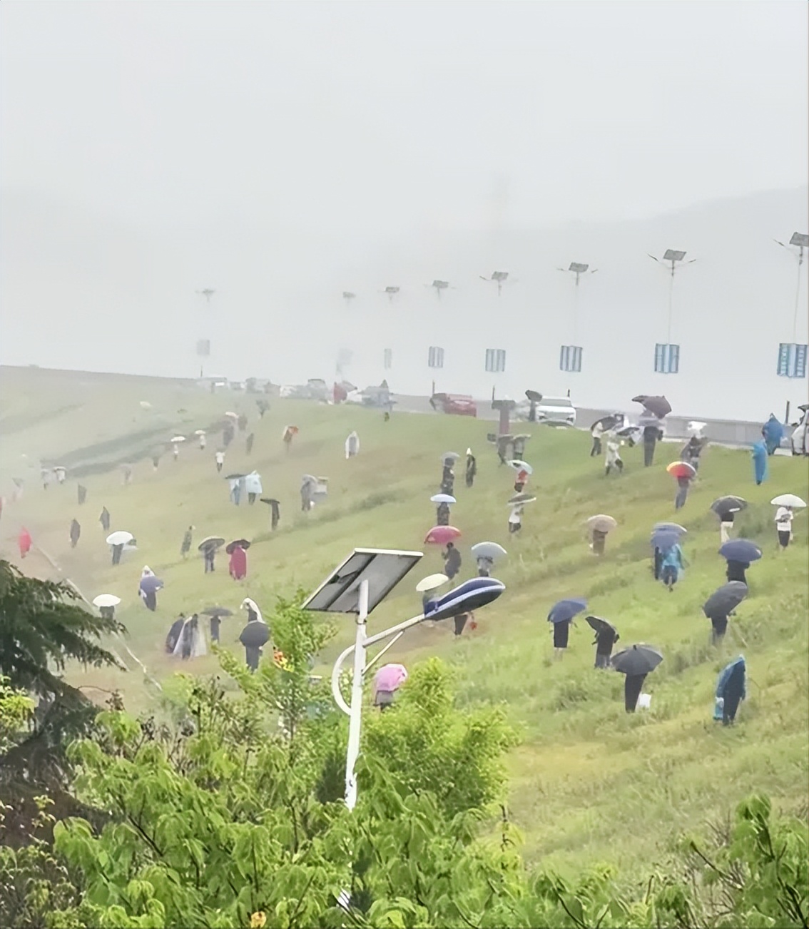 前几天在山东日照的水库大坝上,发生了令人感到惊奇的一幕。天上明明还下着大雨,却有一群人打着雨伞低着头,在大坝前的草坪上找着什么东西。