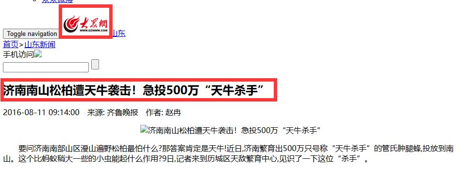 大众网:《济南南山松柏遭天牛袭击!急投500万“天牛杀手”》 2016-08-11