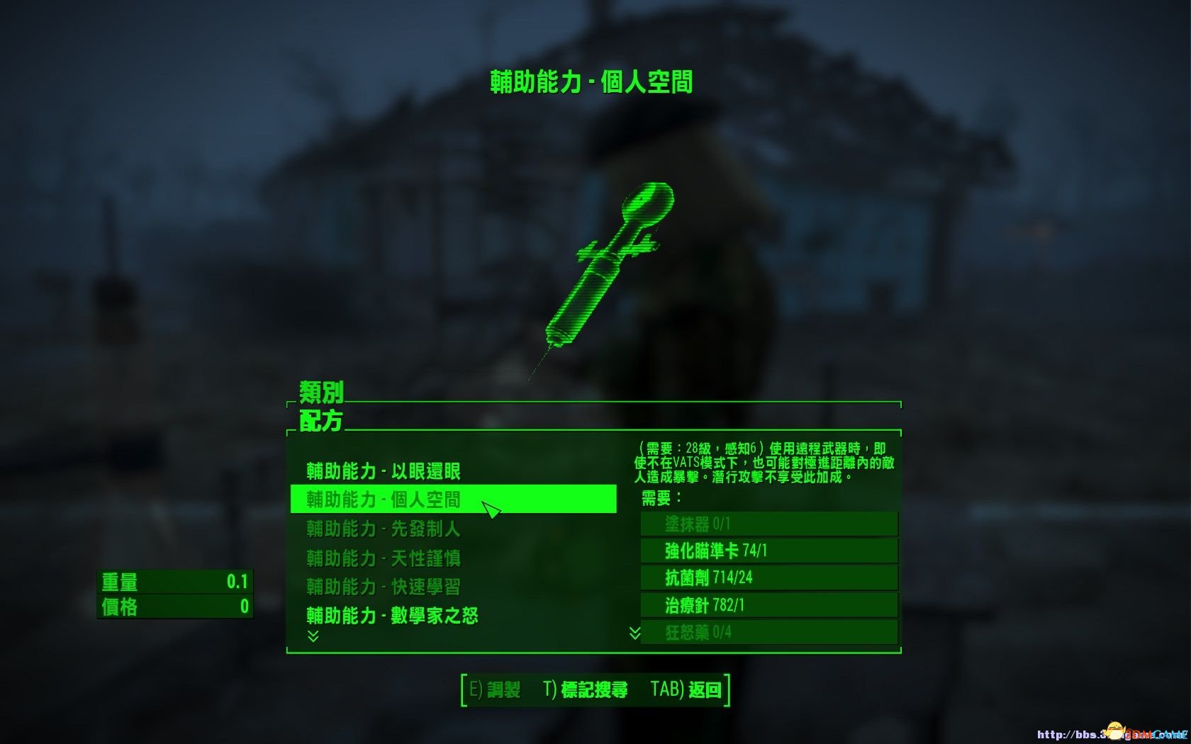 在化学台里增加2个栏目,分别是“特性和更多辅助能力- 辅助能力”和“特性和更多辅助能力 - 特性”。在辅助能力栏目里能制造各种加perk的注射器,不同的perk有不同的要求。在特性栏目里能制造一个全息带,用来添加删除特性。