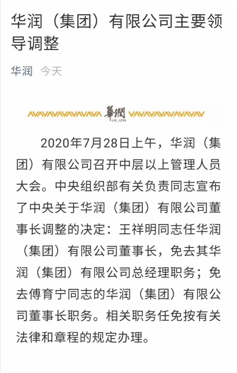 南都记者从华润集团了解,2020年7月28日上午,华润(集团)有限公司召开中层以上管理人员大会。中央组织部有关负责同志宣布了中央关于华润(集团)有限公司董事长调整的决定:王祥明同志任华润(集团)有限公司董事长,免去其华润(集团)有限公司总经理职务;免去傅育宁同志的华润(集团)有限公司董事长职务。相关职务任免按有关法律和章程的规定办理。