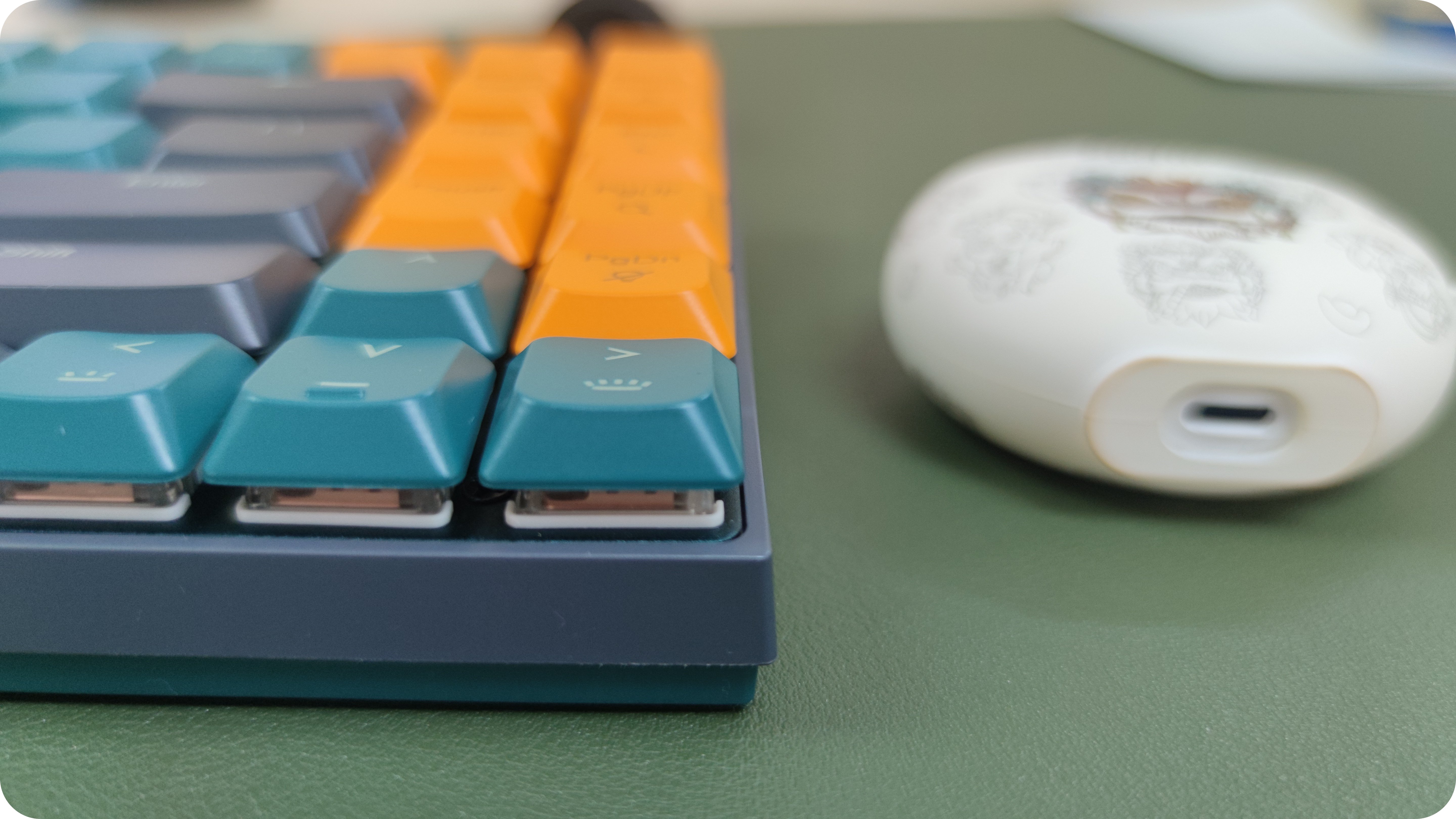 这次购入的配色属于比较耐看的苍岭绿,属于非常耐看的配色,即使在工作环境中也不显花哨。另外橙黄色的功能键还给键盘增加了一些个性化元素。
