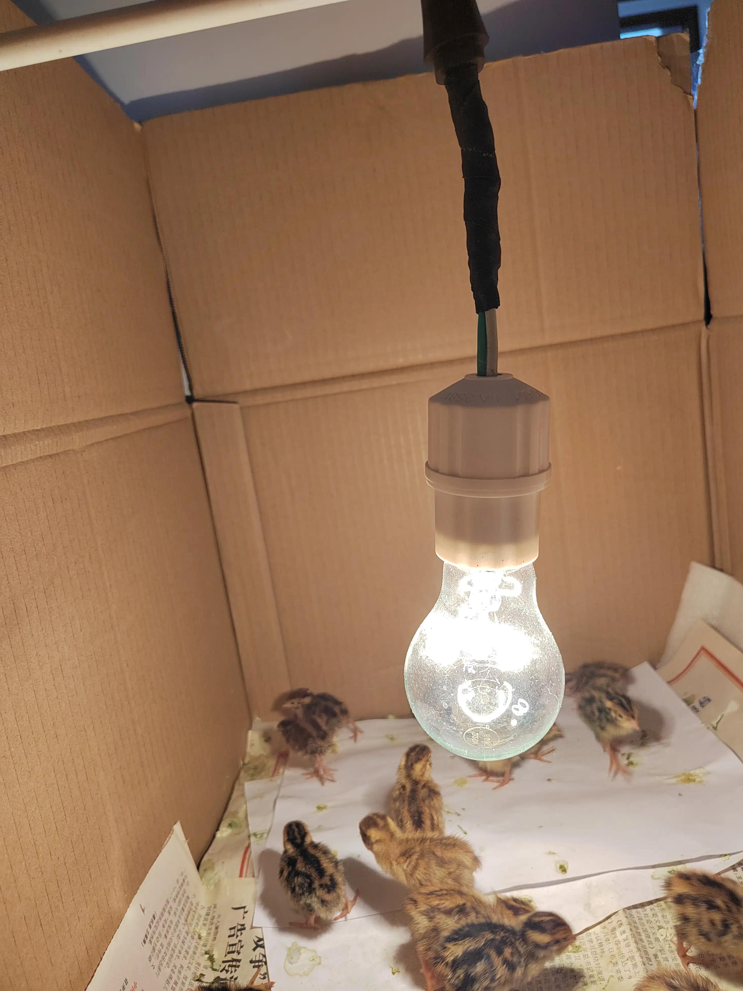 我的育雏箱使用的是厚纸箱,箱底铺一层泡沫,上面铺报纸。纸箱顶部一根铁杆挂上60W白炽灯进行加温,因为白炽灯更容易获取和使用。底部再放个温度计。