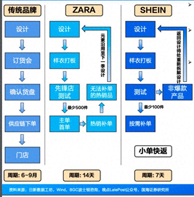 研报中显示,“小单快返”缩短上新周期。SHEIN依托面向客户的网站提供个性化产品推荐,基于购买量、收藏量等反馈快速决定SKU的返单深度,基于其高效的“小单快返”供应链,SHEIN将上新周期缩短到7天,而ZARA的上新周期为14天,传统服饰品牌为6-9个月。