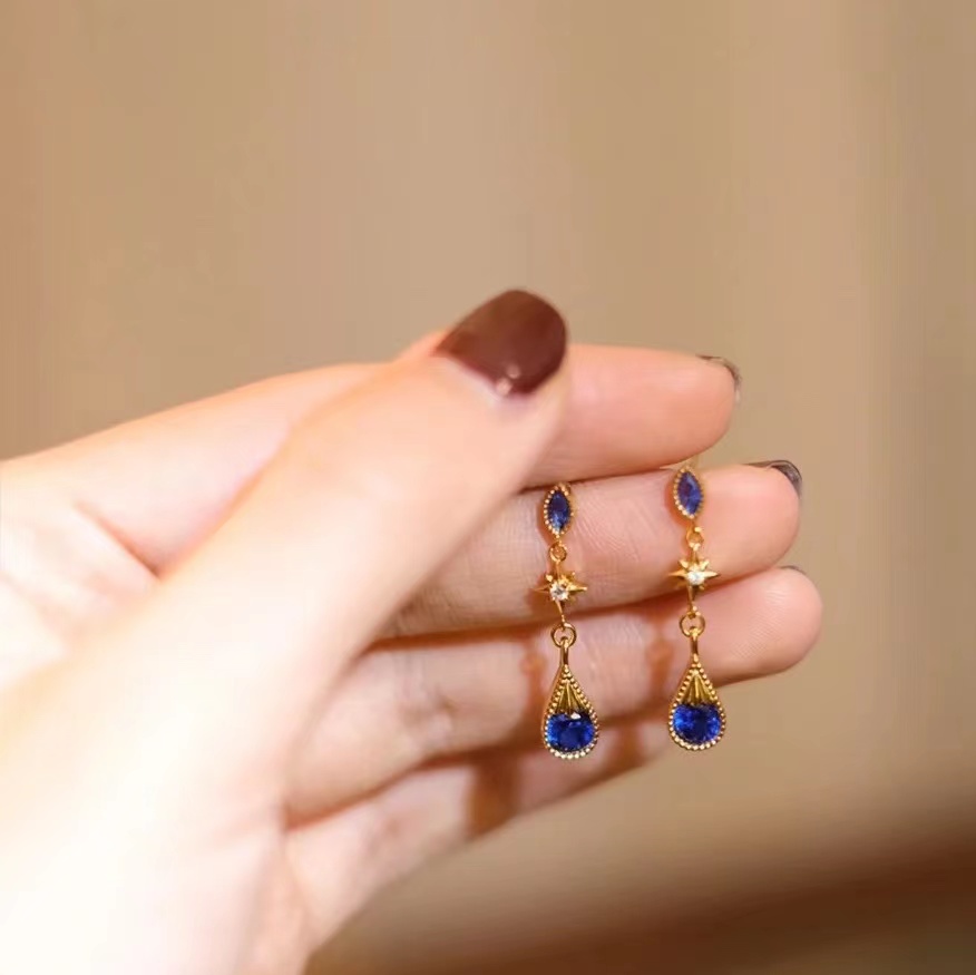 宝蓝色的耳坠与金色系的组合更加华贵大气,这种水滴状的耳钉,确实是一种非常轻盈又浪漫的风格。在在日常的搭配中,这种耳钉会更加适合一些时髦精致的女性。搭配吊带裙,或者甜美风的小裙子,都是一种不错的穿着方式。