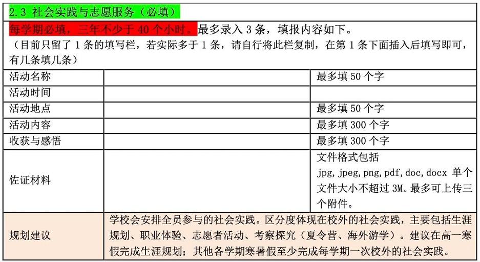 社区服务(必填):2学分,(比如山东综合评价招生条件明确要求高中三年必须达到10个工作日以上)包括参加社会公益劳动、志愿服务等,例如参加帮助孤寡老人、社会福利、救助儿童等等的无偿活动;为保证各项赛事正常进行、环境保护等活动做志愿者。