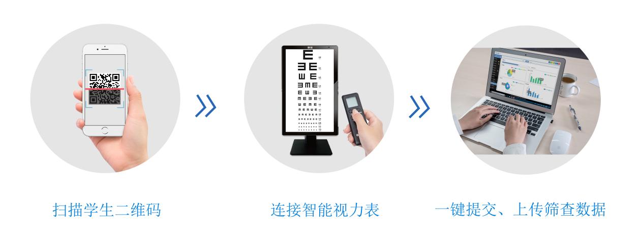 当验光师进入学校进行筛选工作时,在系统上扫描学生筛查档案二维码,系统自动识别学生学校信息;并通过网络连接智能视力表,准确测试学生的裸眼和镜像视力,无需验光师手动判断,系统自动分析,判断视力测试结果,验光师只需一键确认并提交,即可传输到系统。