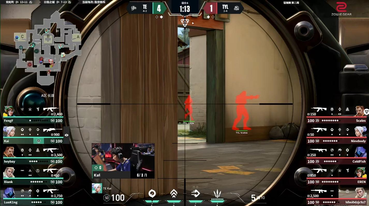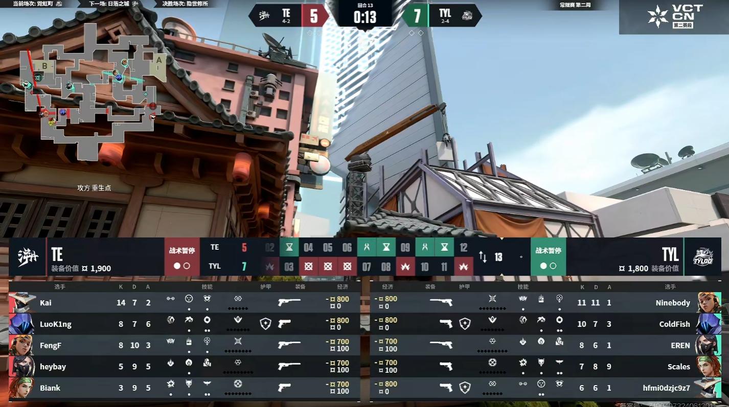 第5回合TYL开局获得人数优势后展现出极强的记录性,退守后点再拿1分,至此TYL上半场开局连拿五分,TE叫出暂停。第6回合ColdFish残局选择失误,被反绕的BianK抓住Timing击杀后拆包,TE获得上半场第一分。