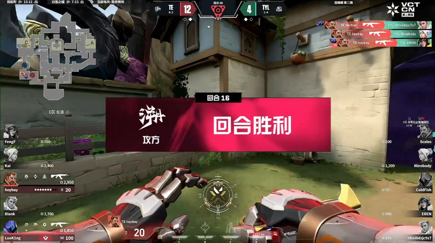 第11回合BianK发挥猎枭进点帮队友拿信息后斩获三杀。TYL被连续追分后叫出暂停。第12回合TYL经济劣势选择混起,但被TE枪线稳稳架住,最后FengF收掉ColdFish获得上半场最后一分。