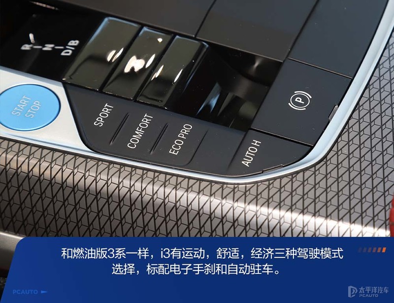 i3的内饰整体布局和i4相同,和3系燃油版车型区别不大,最显著的变化是车机屏幕和电子挡杆。车机屏幕采用了一体式悬浮曲面屏,配备iDrive 8系统,这也是这套车机系统首次在国产车型上搭载。电子挡杆则改成了类似大众系的拨片式电子挡杆,相比3系的“鸡腿”挡杆体积大幅缩小,弱化了换挡机构的存在。整车和3系燃油版车型的区别还体现在方向盘中央的车标和中控的启动按钮上,两者都用上了宝马新能源标志性的蓝色,凸显其纯电车型的身份。