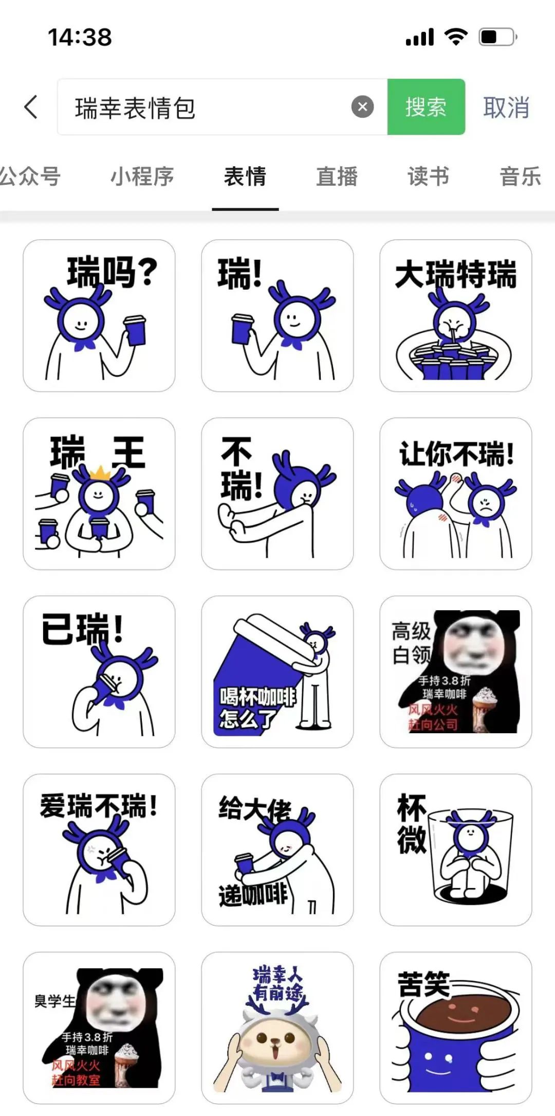 此外,在微信搜索瑞幸表情包还可以发现各种各样的热门二次元表情包,头戴鹿角的瑞幸动漫形象以各种形式呈现,其中“今天,你瑞了吗”更是成为名梗,消费者在聊天之余就能进行互动,加强了传播。