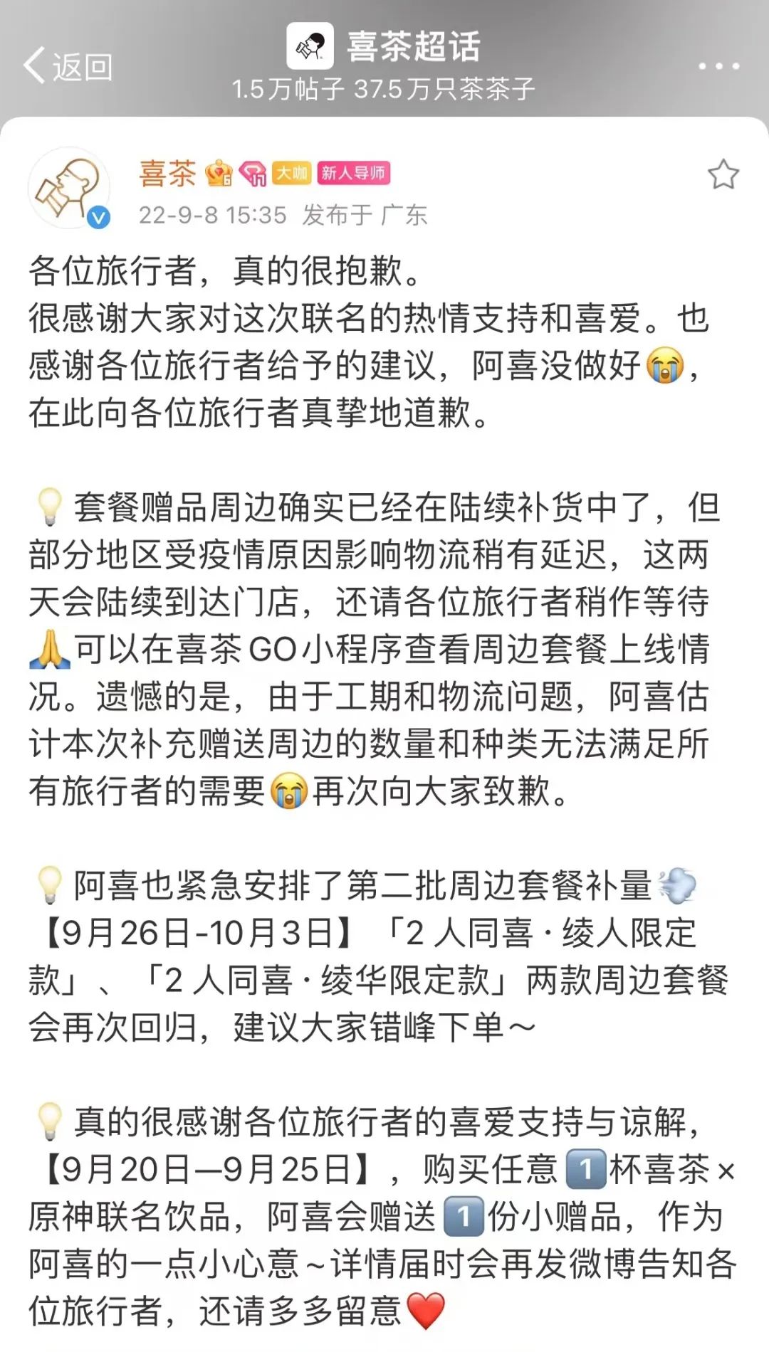 喜茶X原神联名瓶装饮料开售当日,不到一小时的时间第一批存货便已告罄。喜茶官方平台喜茶go以及淘宝都下架了该款联名商品,而其他官方电商渠道天猫也是开启了30天内发货的预售模式,足以见其人气的火爆。