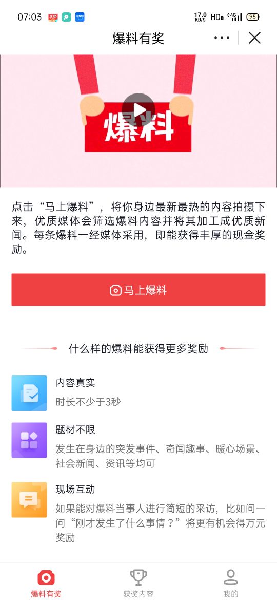 - 不懂的这个任务关注我在评论区告诉我还有一个任务是也是小程序里边的一个爆料这个任务你没有粉丝也可以挣到红包,就是你身边有趣的事和身边有暖心的场景,突发时间都可以拍摄下来上传到爆料里边一旦审核成功了爆料就会给你相应的奖励这个非常好今天就说这里起床洗脸上班了明天继续关注我的我也一定回关谢谢大家