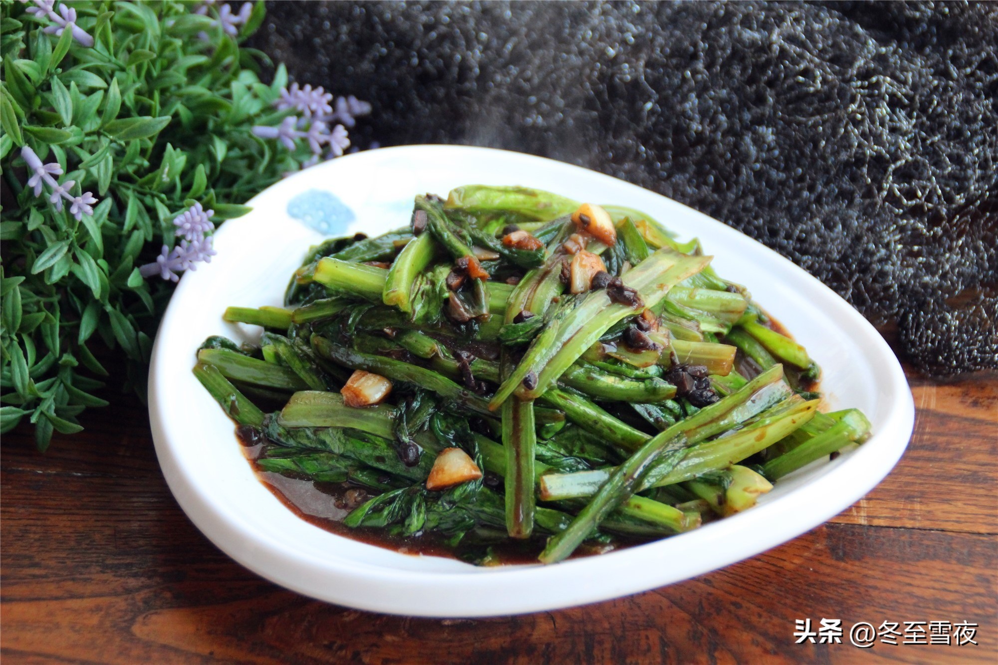 【豆豉油麦菜】所需材料:油麦菜400克、豆豉1汤匙、油盐适量、大蒜3瓣、蚝油1汤匙、鸡精1茶匙、