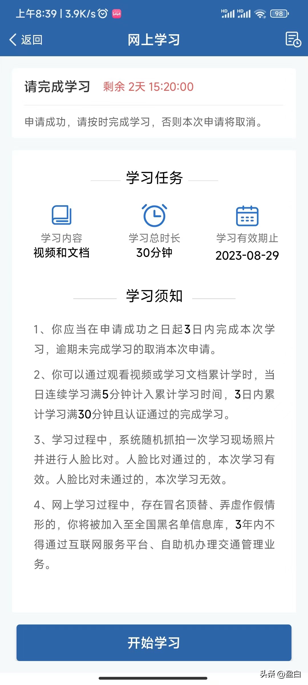 申请成功后需要3天内(申请当天不算)完成累计30分钟的学习,否则系统将取消本次申请。