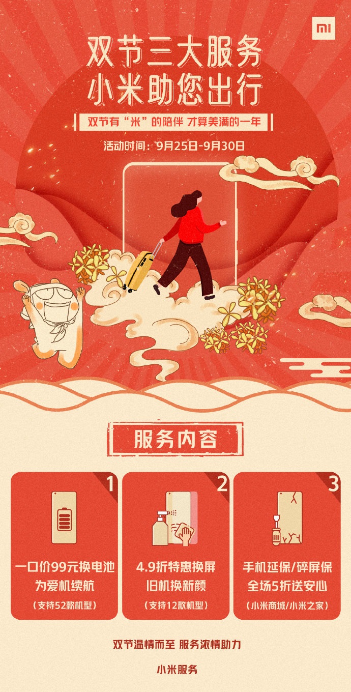 根据小米官方介绍,此次“双节服务”提供三项新的福利,1、一口价99元换电池;2、4.9折特惠换屏;3、手机延保/碎屏保全场5折送安心。