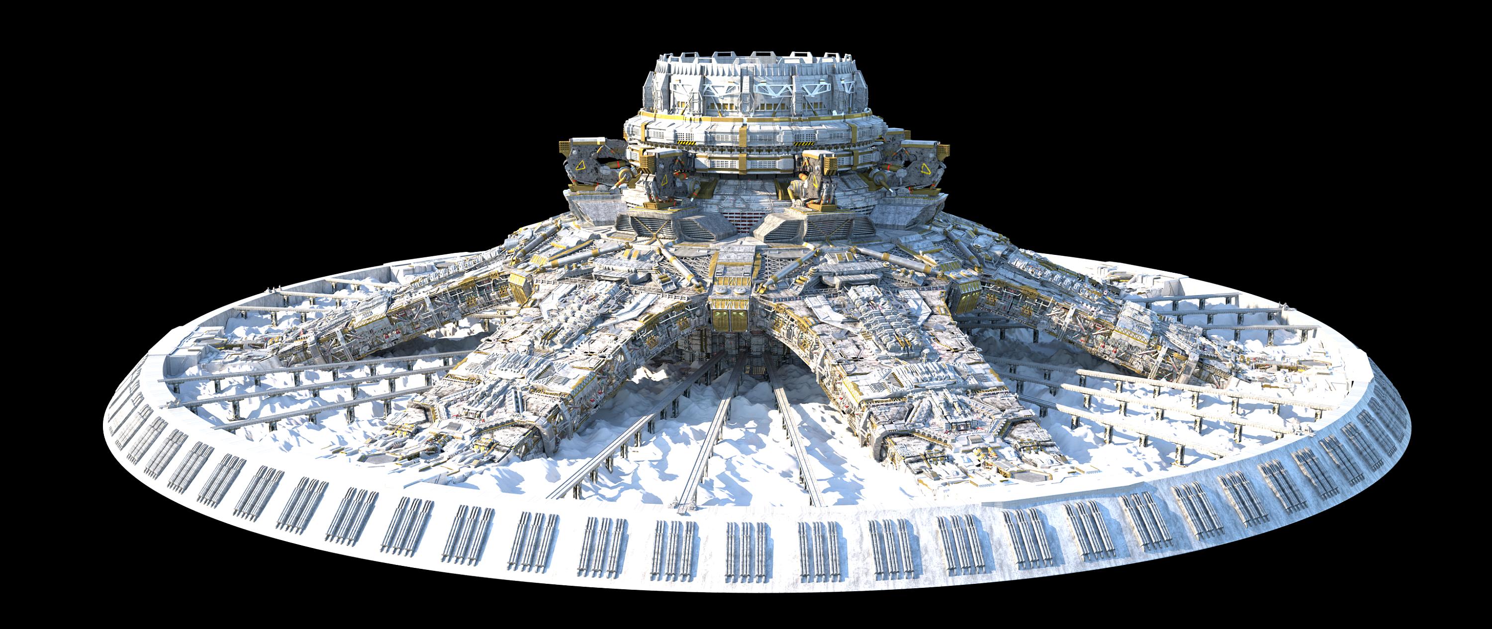 为了让发动机启动时不会下陷,底部用最新的复合材料制作了直径超过100公里的支撑面,以降低对地表压强,中间有7个支撑臂。