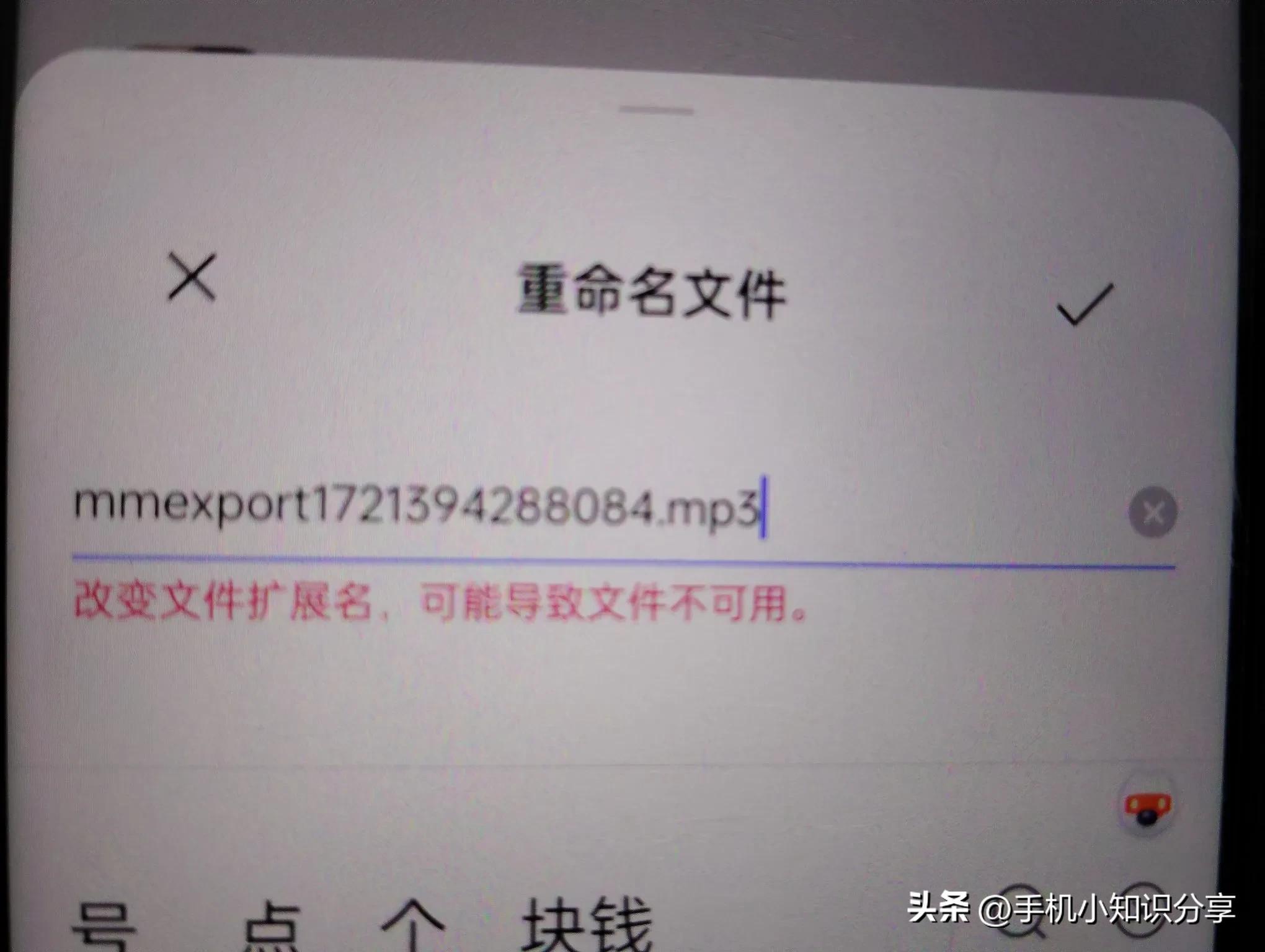 点击对勾,此时系统会提示改变文件扩展名可能导致文件不可用,不用理会,只是视频无法播放而已,音频是没有问题的,直接点击对勾。(如上图所示)