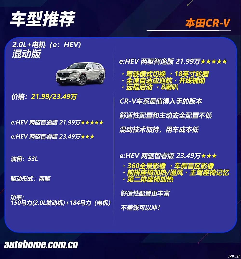 如果想长期持有,则推荐e:HEV的中配车型,本田混动技术加持下,不会心疼油钱。插电混动的e:PHEV版本价格较贵,性价比一般。
