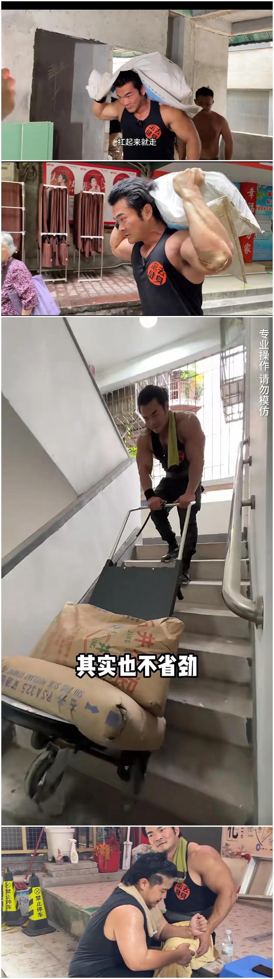 二、第二位挑战的是体德学院校长李维刚,可以看出刚哥的块头是真的大,就这臂围是真的顶,这个身材在健身圈也是少有的,一开始刚哥也是表现出来很轻松的态势,一百斤的水泥扛起来就走,从楼上搬到楼下,这一过程也是不轻松呀,刚哥也是体验上了机器,但感觉也是不轻松于是又换成了人力,刚哥在搬运过程中也是累到了腿抽筋,可见做一天一千的男人也不是那么容易啊,最后刚哥也是以一天450元的成绩收场。