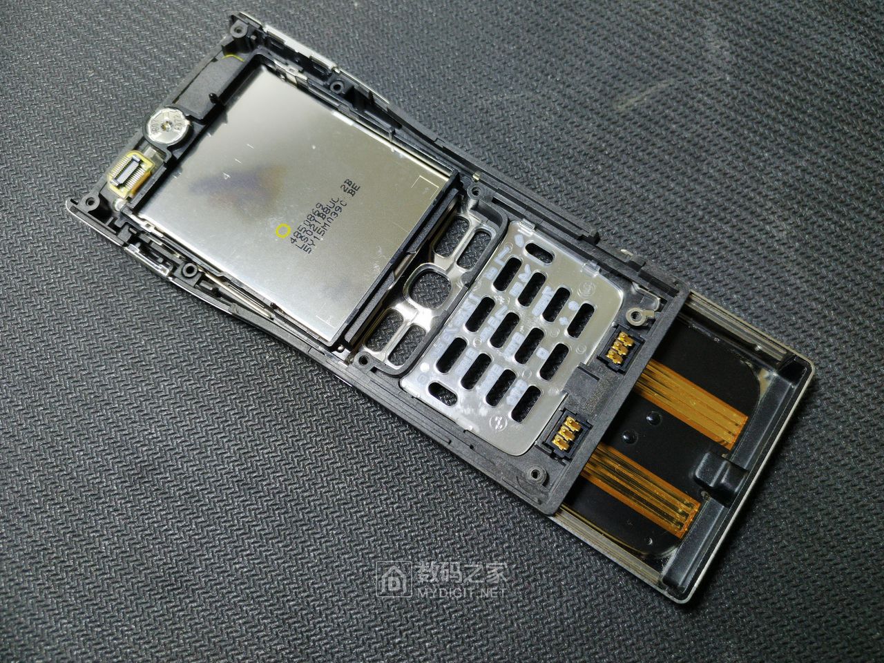 下滑盖滑出状态,下滑盖并没有采用排线,而是靠下面的两组共6根滑道与主板实现电连接,可靠性不做评价: