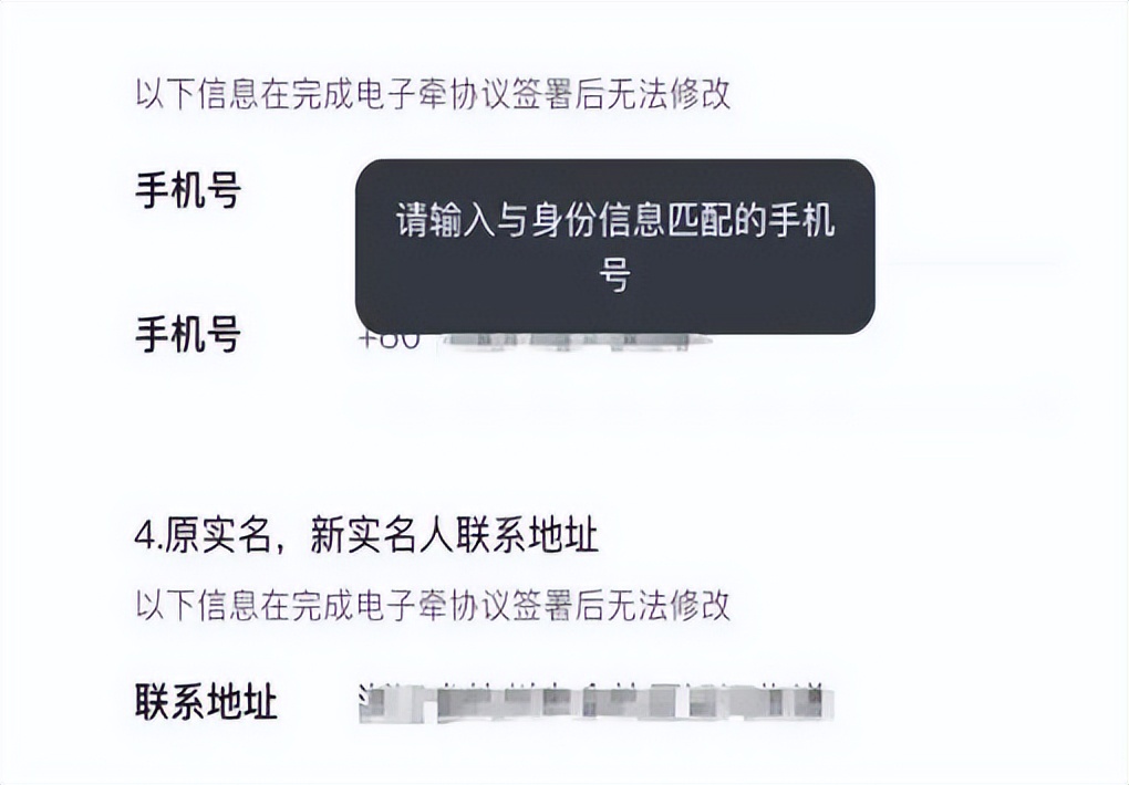 小编提醒一下需要更改实名的朋友们,填写新实名信息时需要检查所填写的手机号的实名人与新实名人是否一致。新手机号的实名人与新实名人一致才可以操作更改实名哦,否则将出现以下提示: