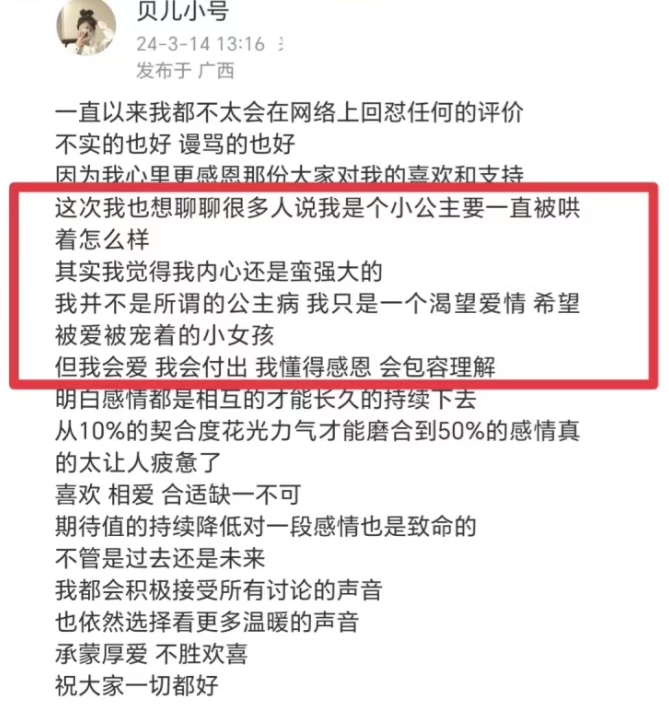 这份回复,与贝儿在情断后公开的分手原因一致:他们本就不是契合的人。
