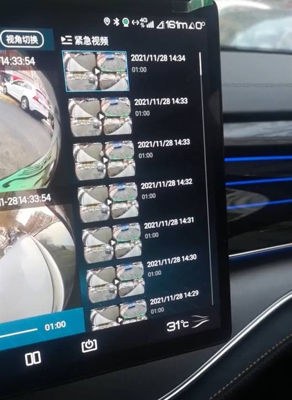 从照片来看,比亚迪“哨兵模式”与行车记录仪位于同一界面,记录的视频保存在“紧急录像”中,每段时长1分钟,记录了前后左右四个方位的视频。