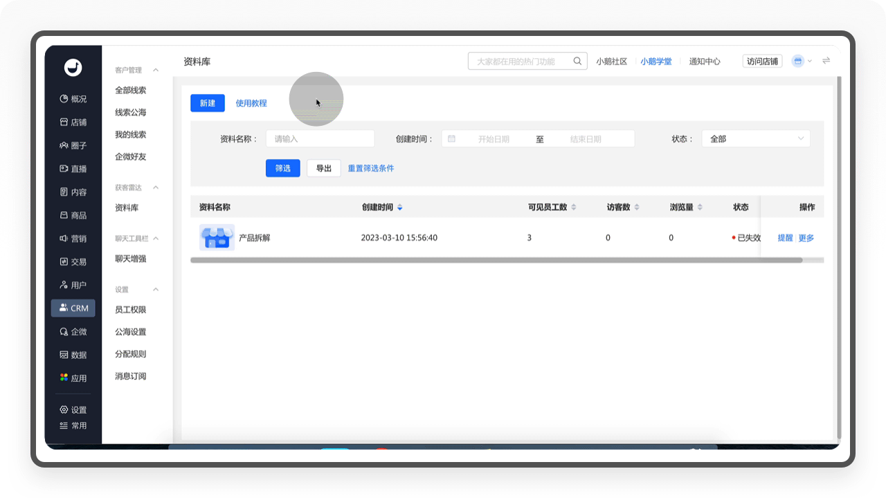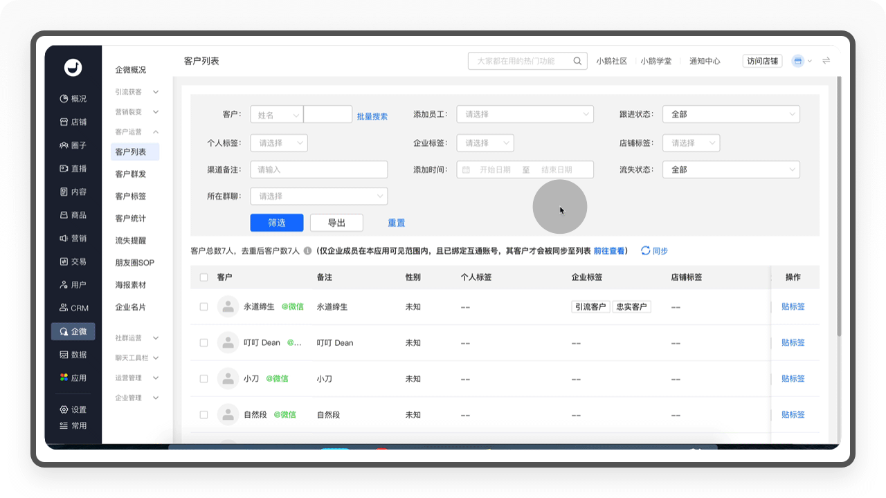 CRM就是指客户关系管理,作为一款SaaS产品,客户管理是系统必不可少的一个版块。小鹅通的CRM,在链接企业微信以后,实现了店铺用户与企微客户的统一管理,沉淀企业私域流量的同时,实现店铺用户的快速跟进转化。