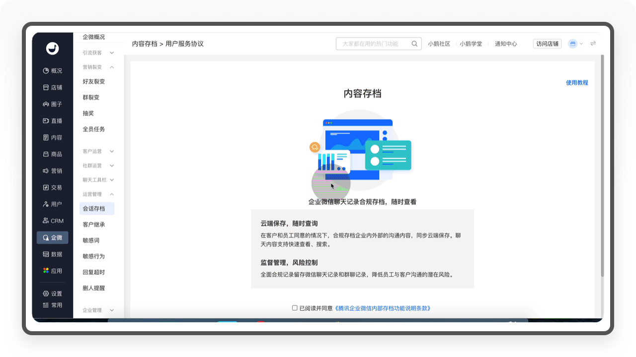 「运营管理」这个版块包含会话存档、客户继承、敏感词、敏感行为和删人提醒等功能,通过这些功能设置,可以有效帮助商家提升运营效率,降低客户流失。