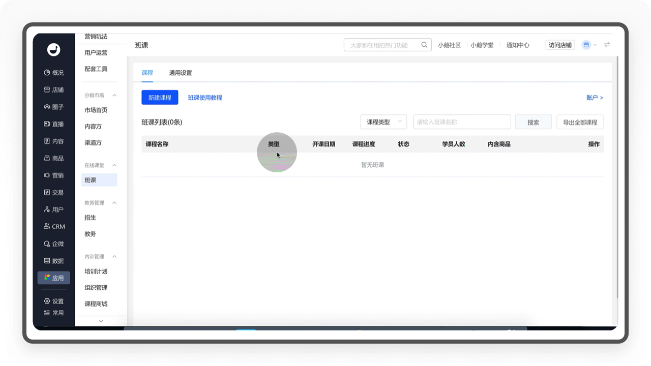 「教务」是针对班级、课程以及考勤的管理,运营者可以在这个栏目对在售课程进行编辑和设置。