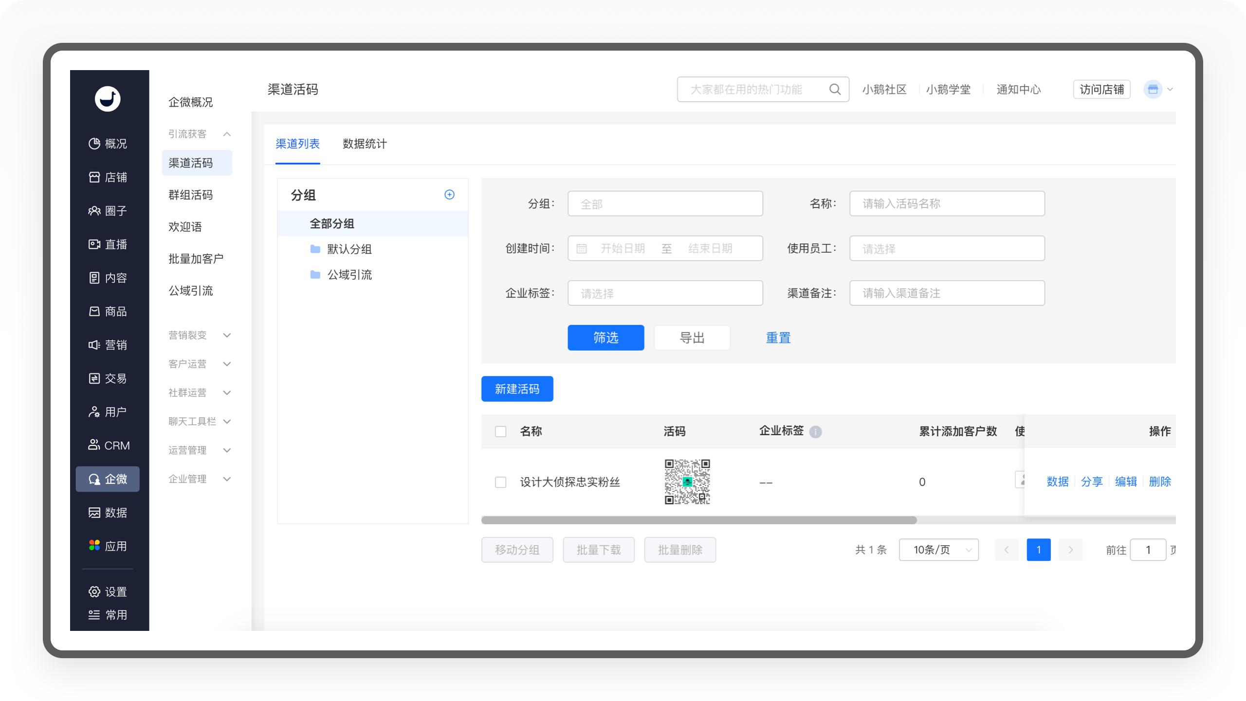 这是小鹅通后台设计拆解的最后一个部分,也将会大家带来被小鹅通官方誉为融合店铺和企微数据的销售管理工具的企微CRM。在体验完这个版块后,我只能感慨,链接了微信生态的小鹅通,几乎满足了所有知识创业者想要实现的功能。