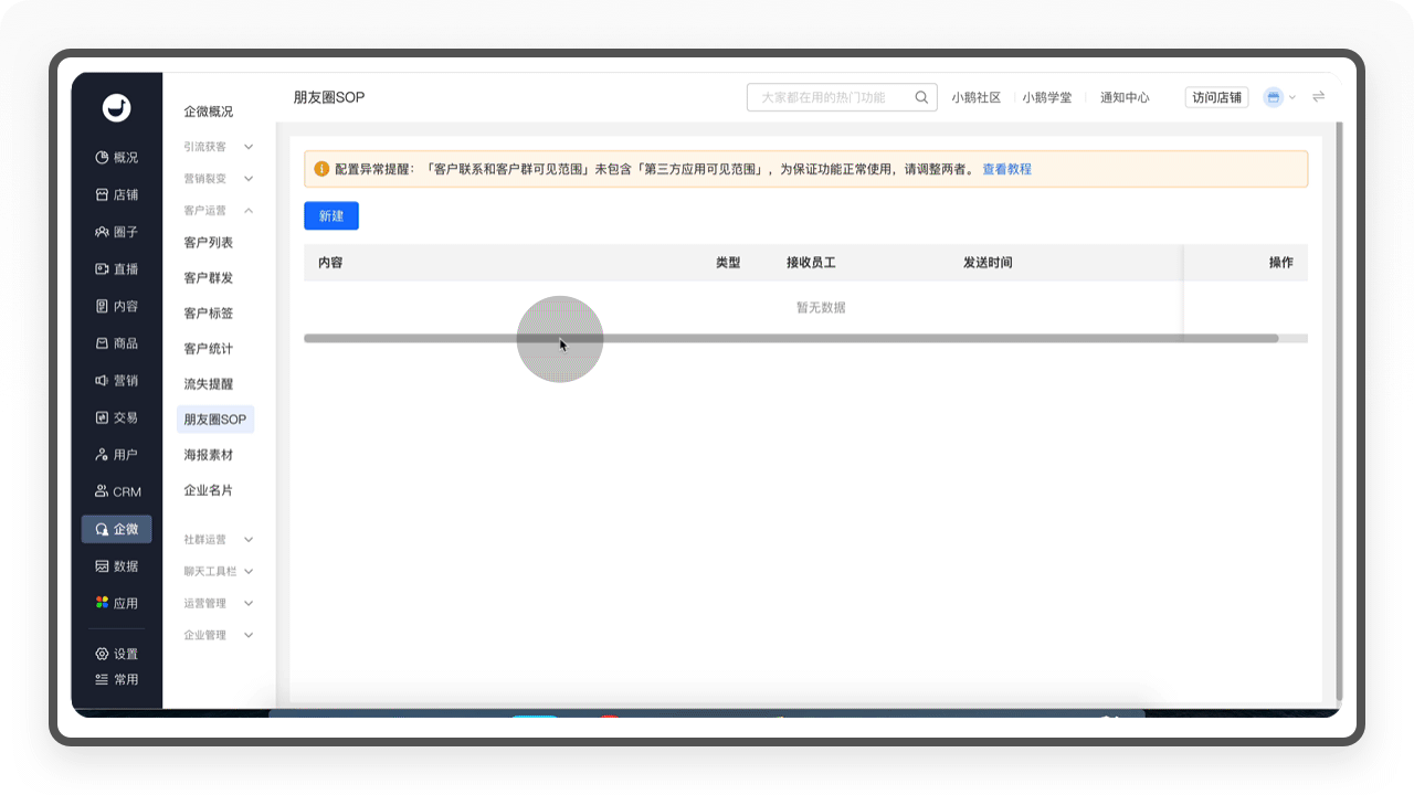 「群SOP」和「朋友圈SOP」一样,主要帮助商家形成对社群运营的标准化,商家可以在后台建立不同的社群规则,通知员工定时给客户群发消息提高客户群运营效率。