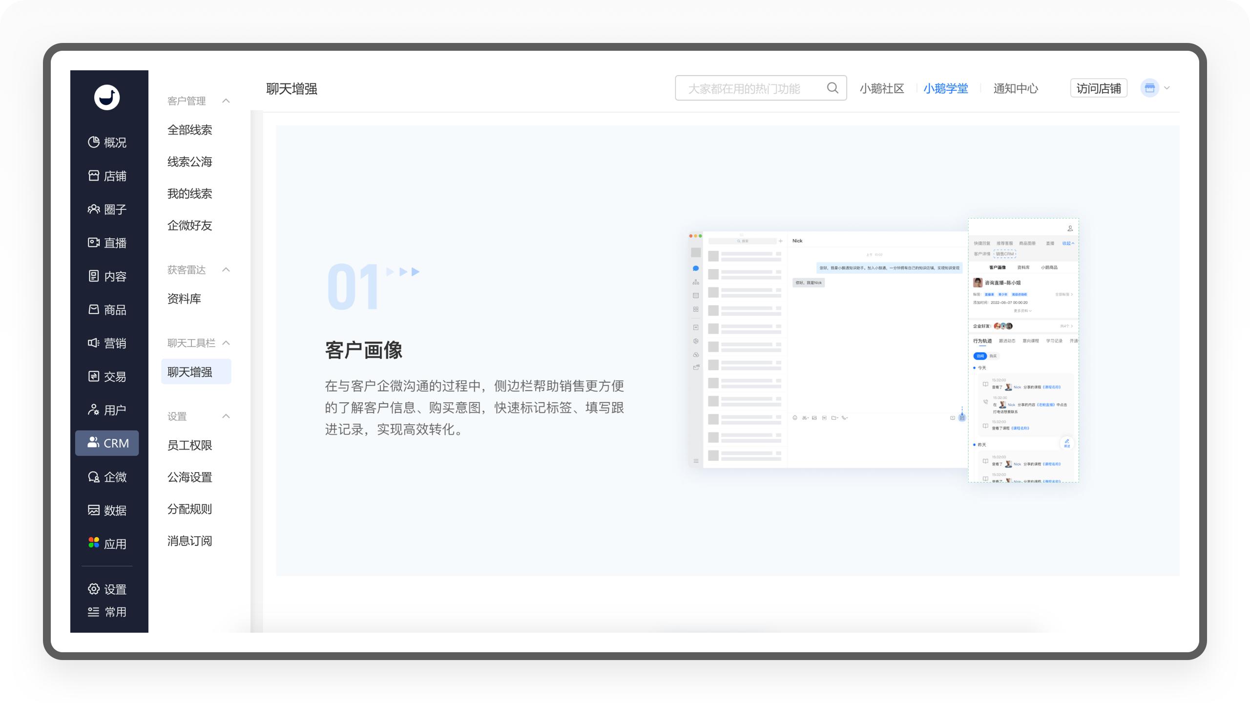 「客户标签」可以帮助商家对不同特征的用户精细化运营和管理,大大提高员工运营效率,而且小鹅通还支持把标签数据同步到企业微信后台,体验非常友好。