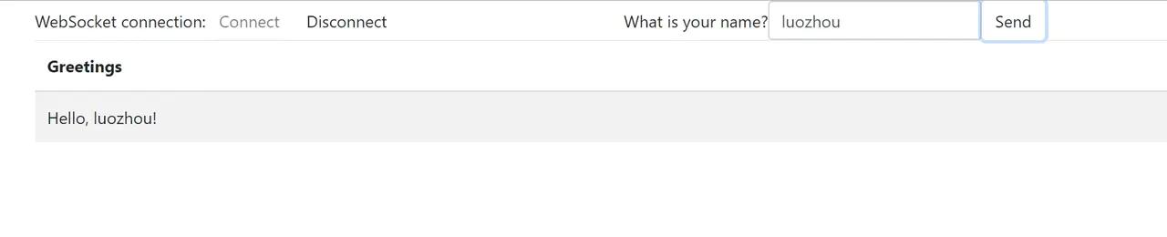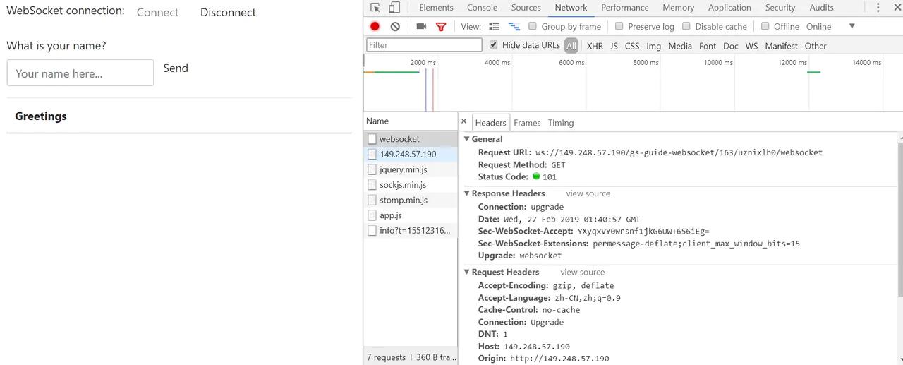 页面提供连接与断开功能,输入自己的名字发送,服务端返回Hello,名字!功能很简单,我们先看看页面的请求和响应。