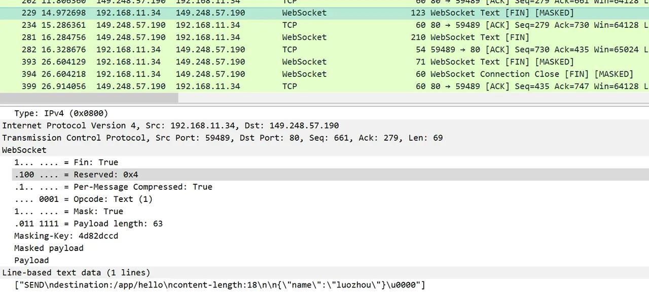 根据上图我们发现 序号229的包是一个文本类型的包,opcode:1,然后采用了掩码处理,同时是最后一个处理包。我们仔细发现所有客户端发送服务端的包都会有[MASKED]标记,服务端返回的没有,这就说明了从客户端向服务端发送数据时,需要对数据进行掩码操作;从服务端向客户端发送数据时,不需要对数据进行掩码操作。