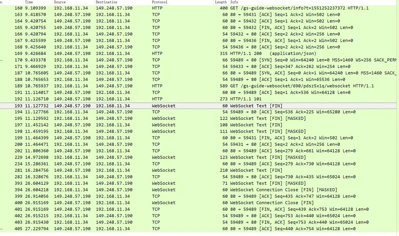 我们根据截图可以知道,B请求对应的响应是序号 192 的数据,返回码是101,根据 HTTP 返回码我们可以知道,服务器已经理解了客户端的请求,并将通过Upgrade 消息头通知客户端采用不同的协议来完成这个请求。在发送完这个响应最后的空行后,服务器将会切换到在 Upgrade 消息头中定义的那些协议,也就是升级为 WebSocket 协议。所以接着193的包已经变成了 WebSocket 协议了。到这里,WebSocket 的握手连接就已经完成了。