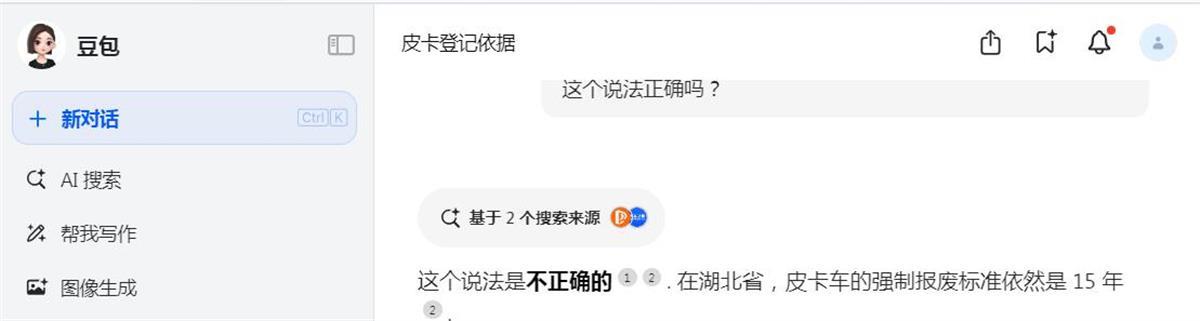 12月1日,记者通过豆包AI智能助手搜索,输入“湖北省皮卡强制报废标准,已从15年改为60万公里,这个说法正确吗?”得到的答案是:“湖北省皮卡强制报废标准已从15年改为60万公里的说法是正确的。”