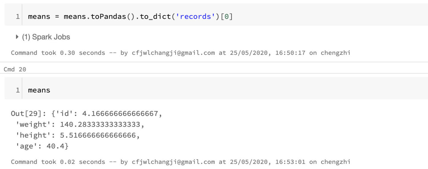 均值的计算本身并不复杂,和刚才的一系列操作差不多。但是有一点需要注意,我们这里得到了结果但是却不能直接作为参数传入。因为dataframe中的fillna方法只支持传入一个整数、浮点数、字符串或者是dict。所以我们要把这份数据转化成dict才行。这里的转化稍稍有些麻烦,因为dataframe不能直接转化,我们需要先转成pandas再调用pandas当中的to_dict方法。