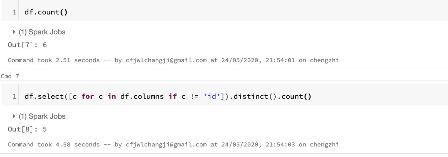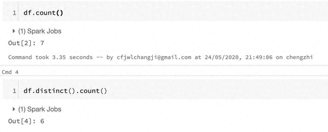 我们先从最简单开始,先来找找完全一样的数据。我们通过count方法可以求出整个数据集当中的条数,通过distinct().count()可以获得去重之后的数据数量。这两个结合一起使用,就可以看出是否存在数据完全重复的情况。