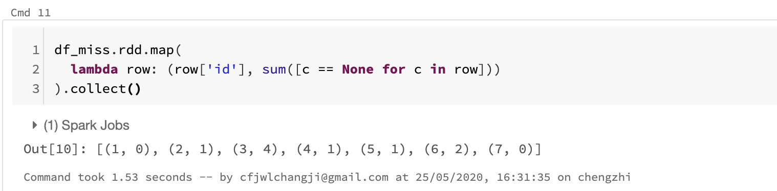 所以我们可能会希望查看一下有哪些样本的缺失比较严重,我们希望得到一个id和缺失特征数量映射的一个pair对。这个操作通过dataframe原生的api比较难实现,我们需要先把dataframe转成rdd然后再通过MapReduce进行: