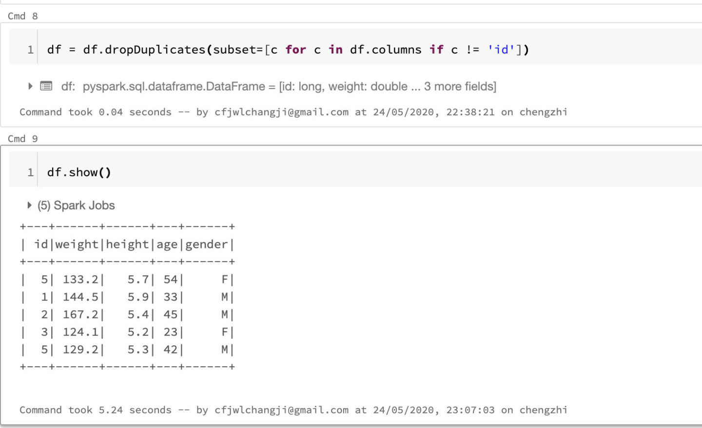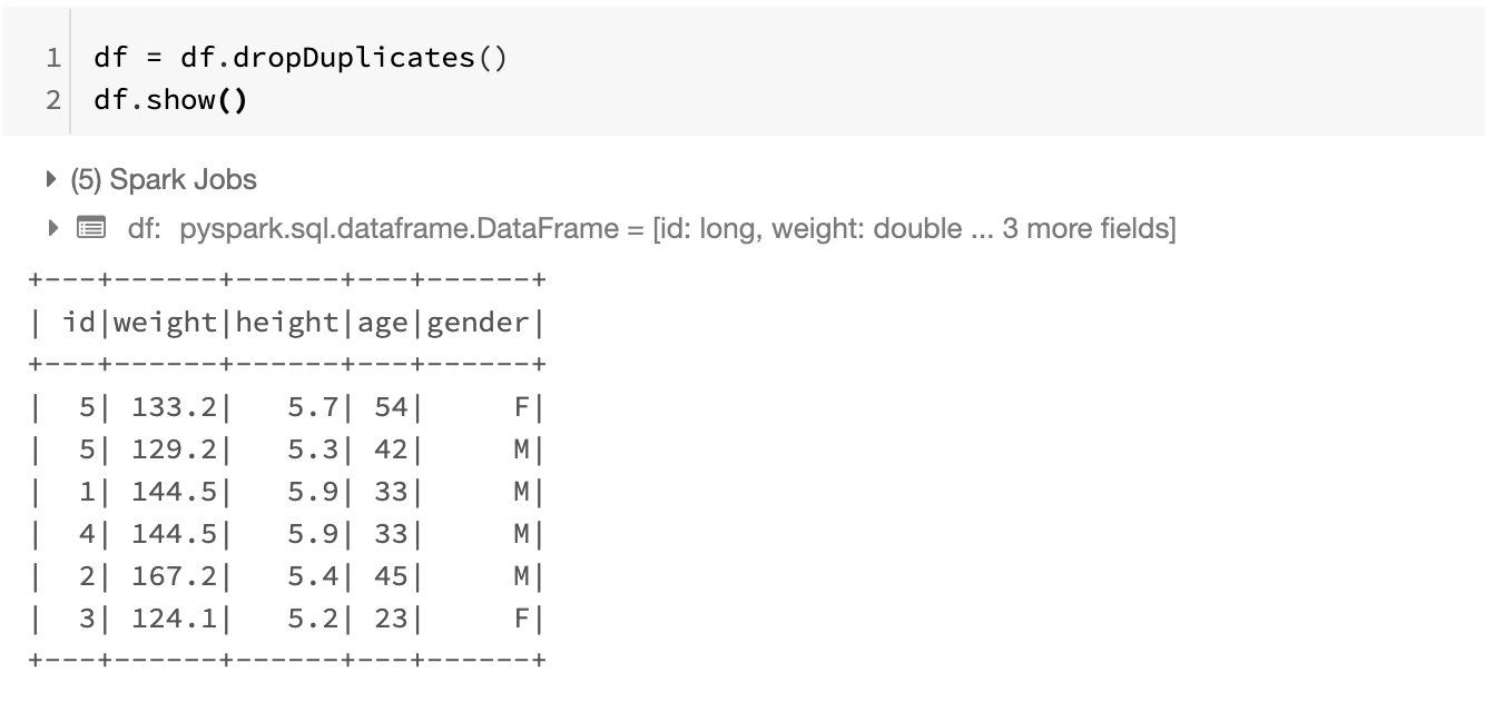 可以看出来,直接count是7条,如果加上distinct的话是6条,也就是说出现了数据的完全重复。那么我们可以知道,我们需要做一下去重,去除掉完全重复的行,要去除也非常简单,dataframe当中自带了dropDuplicates方法,我们直接调用即可: