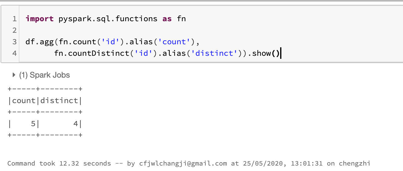 也就是说通过agg我们可以同时对不同的列进行聚合操作,我们发现加上了distinct之后,只剩下了4条,说明存在两条不同的数据id一样的情况。