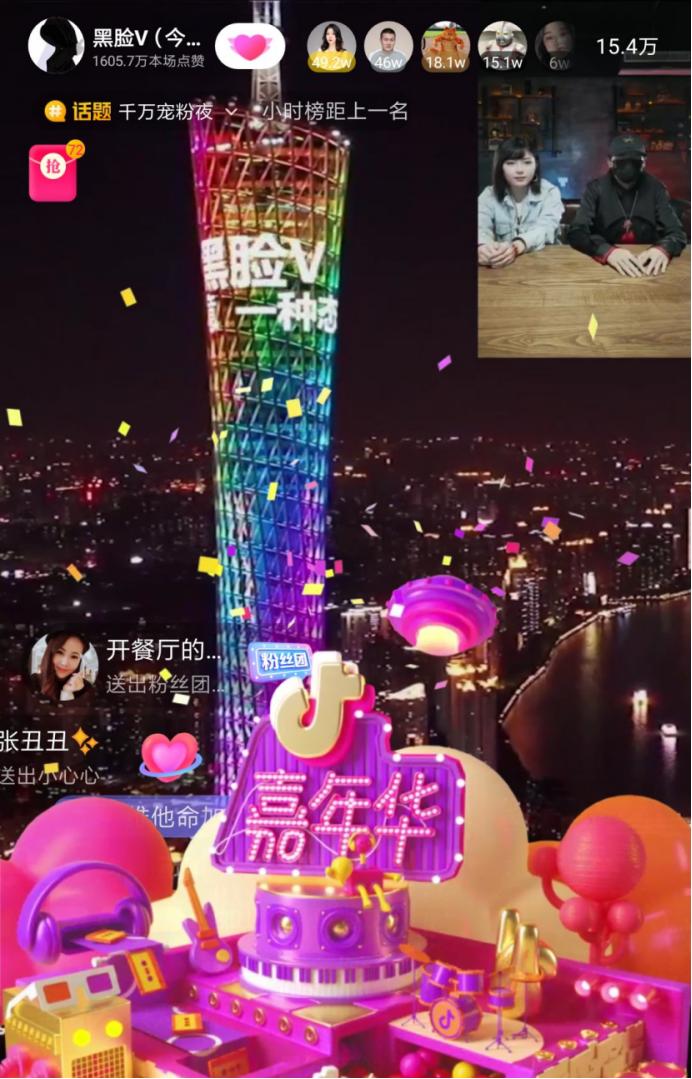 直播间的氛围也相当热烈,除了抽奖之外,他尝试了许多新的方式来增加直播间的趣味性以及粉丝的参与感,例如使用技术手段打造黑脸V专属萌娃小助手黑宝宝,引导粉丝互动;在介绍商品之前先播放一段好玩、洗脑的创意广告片吸引粉丝注意力,增加粉丝购买欲;将创意和直播结合,在直播间变魔术隔空点亮广州塔,粉丝发抖音并@黑脸V就有机会赢得大礼包。