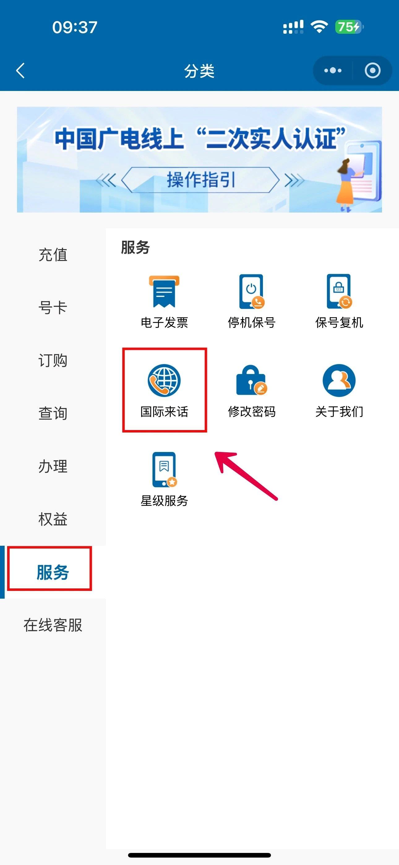 输入验证码开启【国际来话拦截】功能