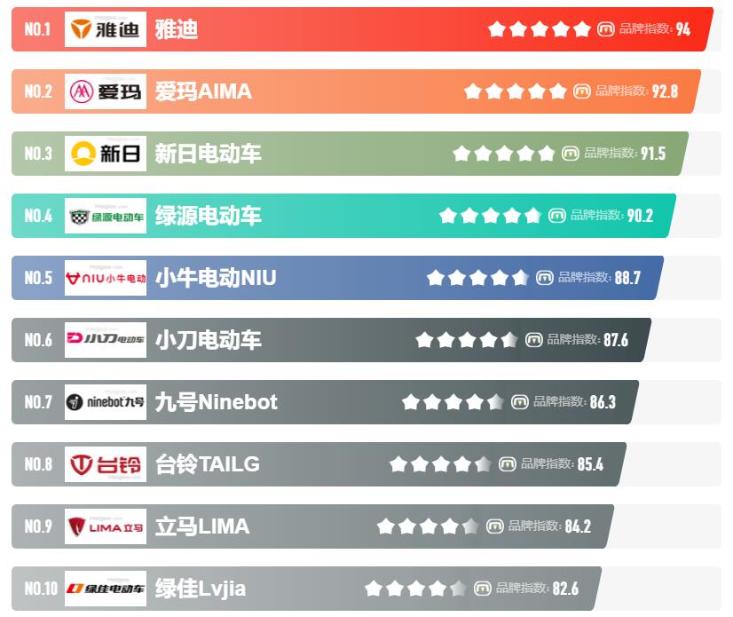 看主要的生产基地,关键是要看头部品牌所在之处,小行家找到目前电动车十大品牌,分别是:雅迪、爱玛、新日、绿源、小牛、小刀、九号、台铃、立马、绿佳。
