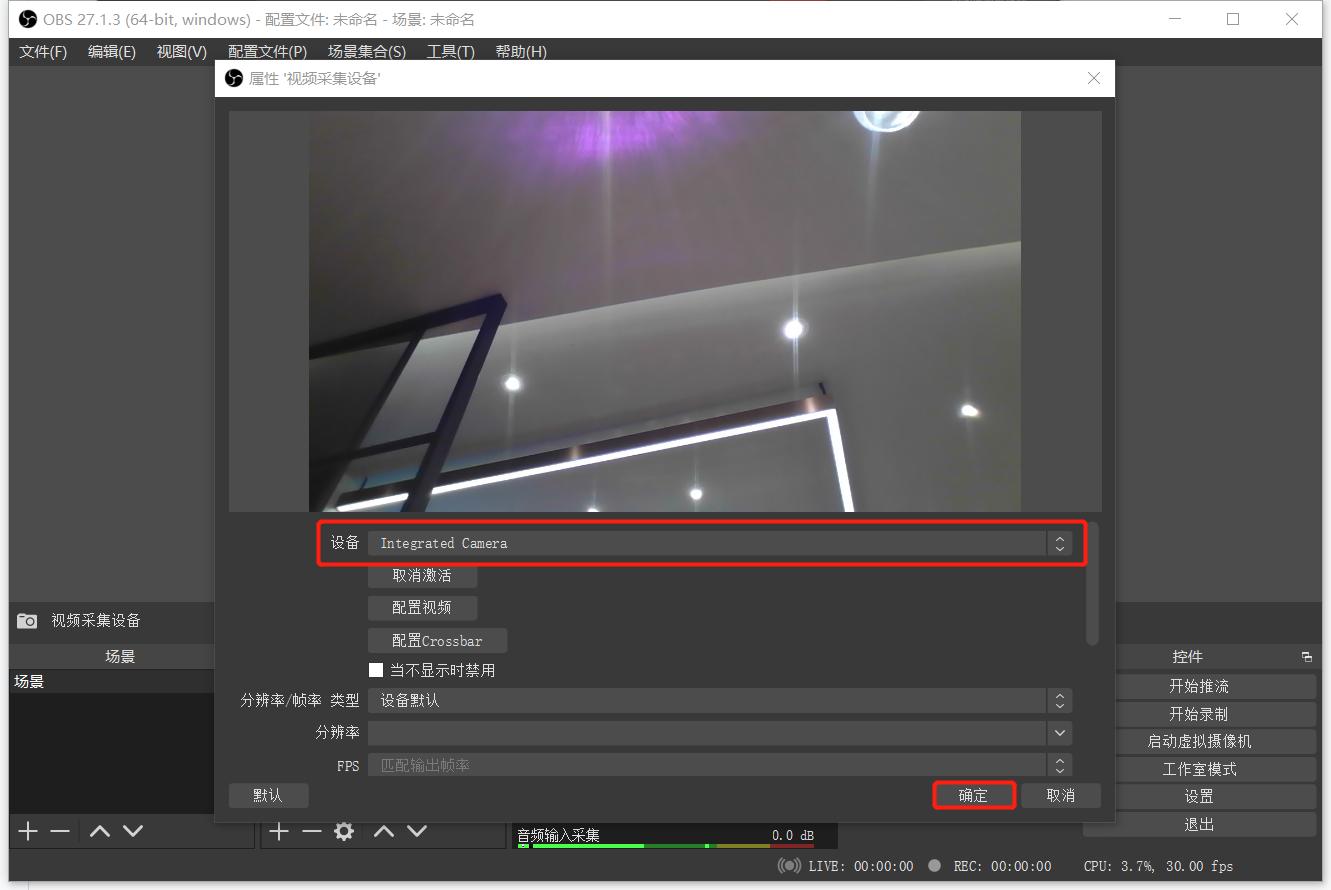 视频采集设备选择“Integrated Camera(集成摄像头)”: