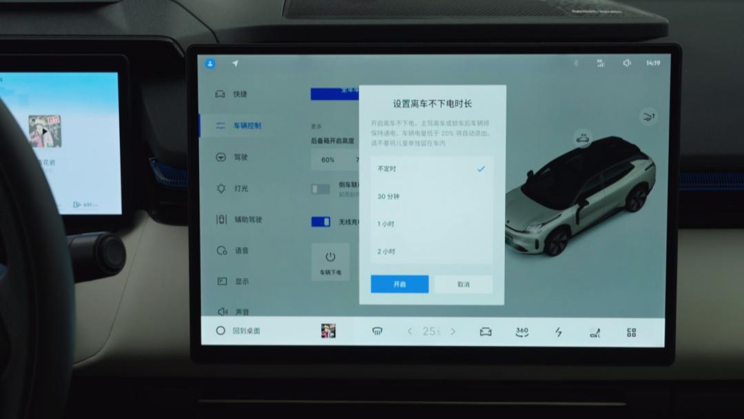 顾名思义,开启这个功能后,短时间内锁车离开,车辆可以继续保持不下电的状态。此时,车内的空调和中控屏也都是正常工作的。