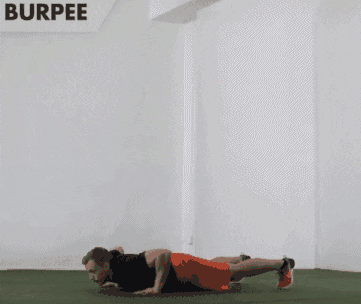 这是个全能型的动作,融合了深蹲、俯卧撑和跳跃。动作要领:从站立姿势开始,迅速下蹲,双手撑地,做一个俯卧撑,再跳起来。 动作进行30秒,重复4组。