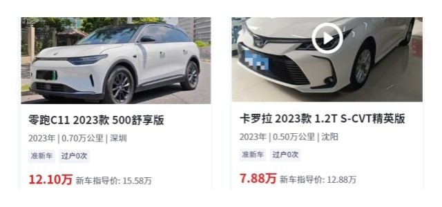 然而大家购买新能源车型,一方面除了关注车型本身的用料是否扎实以外,另一方面非常关注的就是保值率了。说实话,大部分观众也都知道普遍新能源车型均存在不保值这一标签,但对于这台零跑C11来说,它的保值率一直是众多新能源车型中比较突出的状态。举例说明,经笔者在二手车平台查询得知,一台2023年且行驶了0.7万公里的零跑C11 500舒享版,目前在售价格为12.10万,通过与当初的指导价15.58万计算得知,这台零跑C11一年保值率约为78%,不得不说,这个保值率还是相当之高的。我们再拿不少消费者心目中认可保值车系的日系车型来横比,一台2023年且行驶了0.5万公里的丰田卡罗拉1.2T S-CVT精英版,目前在售价格为7.88万元,通过同样的计算方法可以得知,它的保值率为61%。